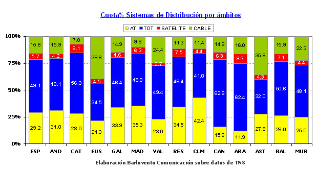 Canarias y Aragón se mantienen por delante en cuanto a penetración de la TDT se refiere, con un 62,8% y un 62,4% respectivamente, quedando la analógica con un 15,6% y un 11,9% respectivamente. En tercer lugar queda Cataluña con un 56,3% y un 28,0% de analógico. Castilla La Mancha es un mes más la comunidad con más porcentaje de sintonía en analógico con un 42,4% de cuota de pantalla, mientras que País Vascos es la región donde el porcentaje de TDT es menor (34,5%) ya que cerca del 40% se trata de distribución por Cable.
