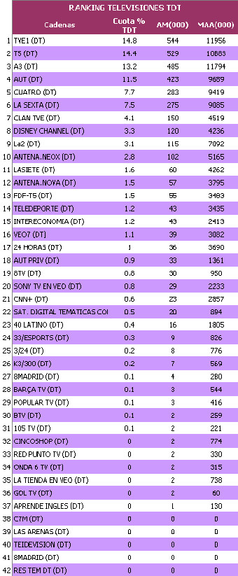 La 1 arrebata a Telecinco el puesto de la cadena más vista de la TDT con un 14,8% frente al 14,4% de la cadena de Fuencarral. Antena 3 se mantiene como tercera opción con un 13,2% de cuota de pantalla. Por su parte, Cuatro (7,7%) sigue en la cuarta posición tan sólo dos décimas por delante de laSexta (7,5%).