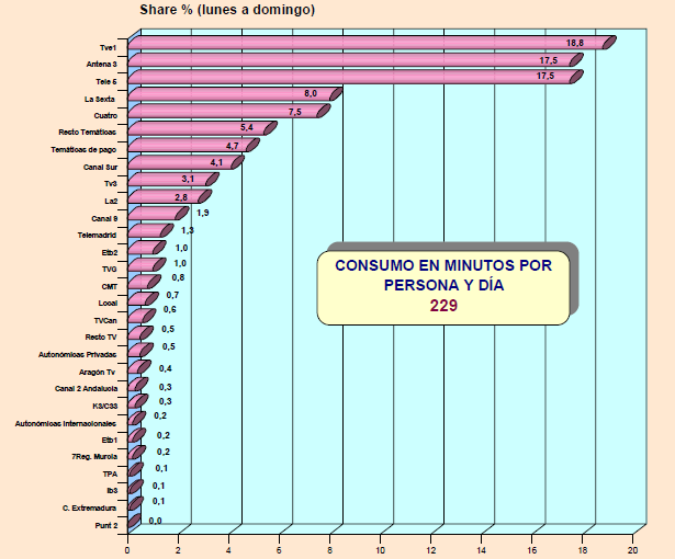 La AIMC ha hecho públicos hoy los datos del Estudio General de Medios (EGM), correspondiente al periodo entre febrero y noviembre de 2009. En televisión, el EGM también otorga el liderazgo a La 1 de TVE. Telecinco y Antena 3 empatan en segundo lugar, mientras que laSexta supera a Cuatro según este estudio que otorga menor peso a las temáticas del que les atribuye TNS.