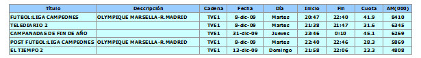 La1 (16,6%) iguala su resultado de noviembre y mantiene su posición de cadena más vista en diciembre por los españoles. Es la opción más vista por los hombres, los mayores de 45 años y en las regiones de Galicia, Madrid, Valencia, Resto, Castilla La Mancha, Aragón, Asturias, Baleares y Murcia y comparte el liderazgo con Telecinco en el público femenino. Además, como viene siendo habitual, es la cadena líder en las franjas de sobremesa, tarde y "prime-time". La emisión más vista del mes corresponde al partido de fútbol "Olympique Marsella-R. Madrid" con 8.410.000 espectadores y 41,9% de cuota de pantalla.