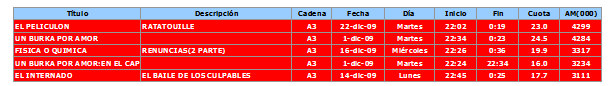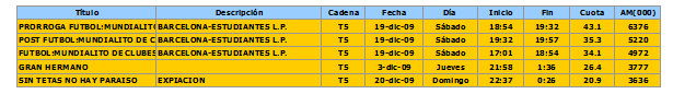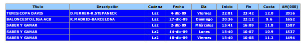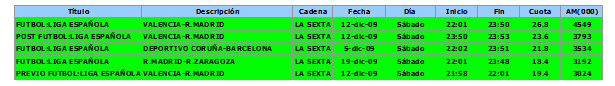 Con un descenso de una décima, laSexta (6,4%) registra su resultado más bajo de los últimos doce meses. El ránking de sus emisiones más vistas está copado por retrasmisiones deportivas y lo encabeza el partido de Liga Español "Valencia-R.Madrid" con 4.549.000 espectadores y 26,8% de cuota de pantalla. La primera emisión no deportiva de su ránking corresponde a "El Mentalista" con 2.388.000 espectadores y 11,9% de cuota de pantalla.