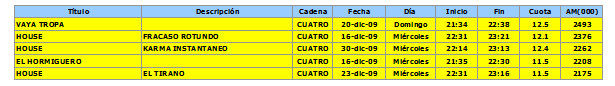 Cuatro (7,6%) experimenta un leve descenso en el mes de diciembre. Entre sus emisiones más vistas figuran el programa "Vaya Tropa" con 2.493.000 espectadores y 12,5% de cuota de pantalla, además de "House" y "El Hormiguero". El perfil de la audiencia de Cuatro se caracteriza por obtener plusvalías en el público masculino y los jóvenes de 13 a 24 años, siendo el 'late-night' y la sobremesa las bandas horarias donde registra un mayor rendimiento de audiencias.