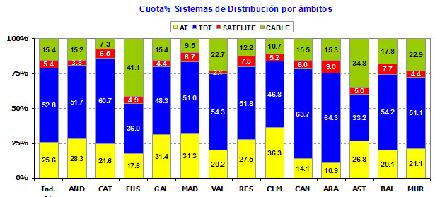 Un mes más, la TDT (52,8%) bate su récord mientras que el sistema Analógico Terrestre (25,6%) firma su mínimo mensual. Por su parte, el Cable (15,4%) y el Satélite (5,4%) se sitúan en torno a sus registros habituales con sólo unas ligeras variaciones.