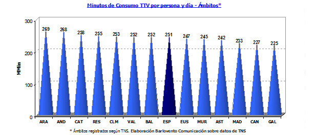 En el presente de diciembre el consumo televisivo registrado es de 251 minutos de media diaria por cada ciudadano, lo que supone un incremento de tres minutos con respecto al mes de diciembre de año pasado. La región donde más se ve televisión es en Aragón con 269 minutos, mientras que en Galicia el promedio es de sólo 225 minutos.