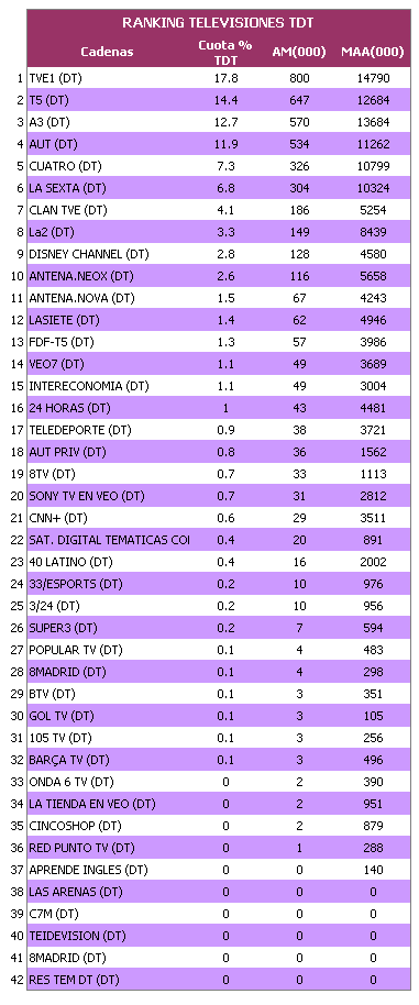 Por cadenas, La 1 suma un total de 2,6 enteros, 6 décimas más de lo que gana en la suma de todos los sistemas. Baja Clan TVE pero se mantiene como el temático digital más visto. Desgaste de Cuatro y laSexta y primera aparición de Gol Televisión en la TDT con un 0,1%.