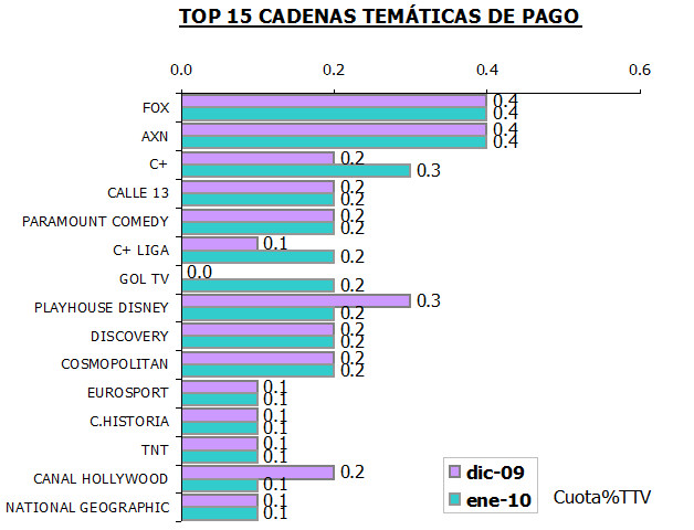 Respecto a las cadenas Temáticas de Pago, suben dos décimas respecto al mes de diciembre con un 7,3% de cuota de pantalla, siendo Fox y AXN las que recaudan una mayor audiencia con un 0,4% sobre el total, al igual que en diciembre. Canal+ queda en tercer lugar con un 0,3% de cuota de pantalla.