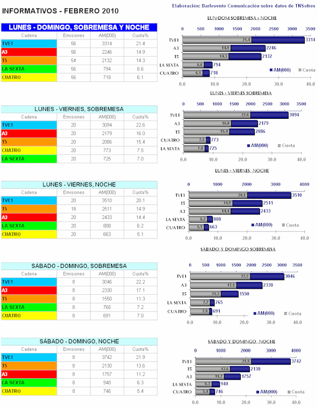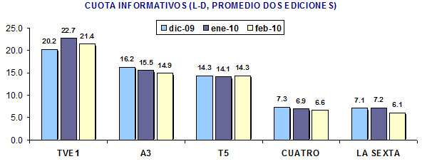 En su ponderación mensual cabe destacar la bajada de 1,3 puntos que experimenta La 1 respecto al mes pasado. En diciembre, los Tedés promediaron un 20,2% y en enero -sin publicidad de por medio- se alzaron hasta un 22,7%. Un mes después, durante febrero, la pública baja hasta quedarse con un 21,4%.