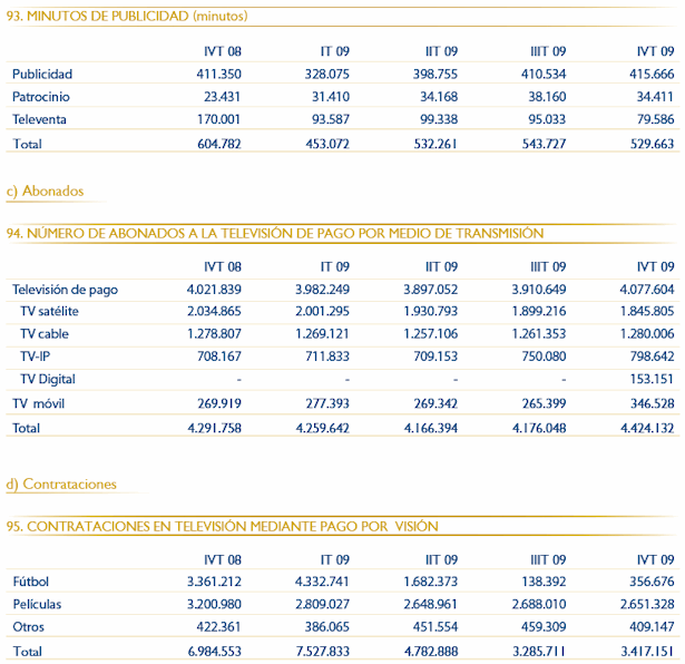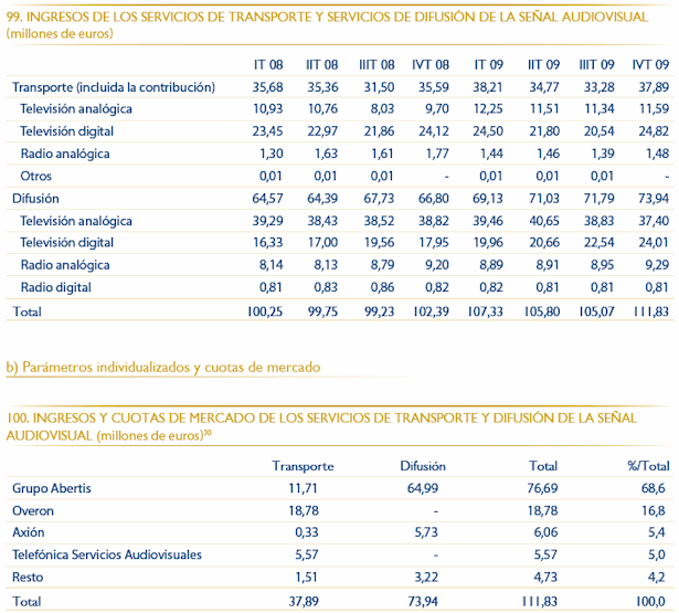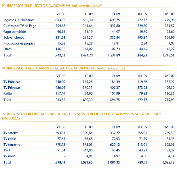 Los ingresos publicitarios en el sector audiovisual fueron de 779,98 millones de euros frente a los 843,55 en el mismo periodo del año pasado, si bien esta reducción está fundamentalmente motivada por el final de la publicidad en TVE, ya que las privadas consiguieron facturar 496,70 millones de euros, 10,64 millones más que en último trimestre de 2008.