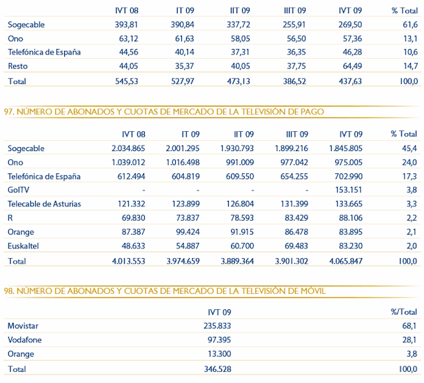 En la televisión de pago, el número de abonados fue de 4.077.604, 56.000 abonados más que a finales de 2008. Sin embargo, el reparto es bien distinto a cómo era entonces: mientras que el satélite (Digital+) cae en 189.000 abonados, la TDT de pago aparece con 153.000 abonados. Los operadores de IP-TV suben en 90.000 abonados arrastrados por Imagenio, que decidió incluir Gol TV dentro del paquete Familiar de la plataforma sin coste adicional para sus abonados.