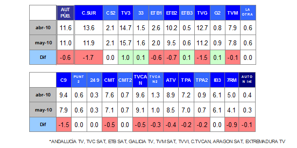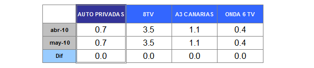 El grupo de Autonómicas Privadas (0,7%) igualan su resultado del mes abril. Las tres emisoras registran el mismo dato que en abril; la catalana 8TV (3,5%), la madrileña Onda 6 (0,4%) y la canaria A3 Canarias (1,1%).