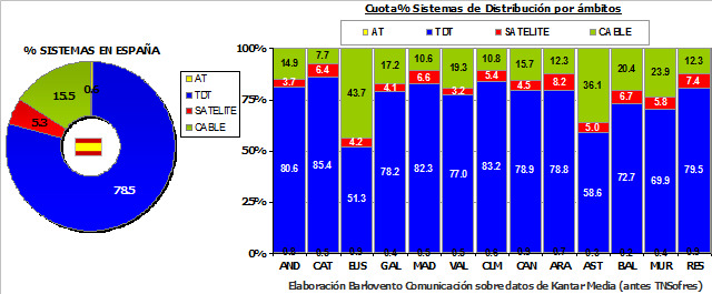En el segundo mes tras el apagado analógico, vuelve a aumentar el consumo de TDT (78,5%) que firma nuevo récord. Por su parte, el Cable (15,5%) gana dos décimas, destacando sus resultados en País Vasco y Asturias, y el Satélite (5,3%) pierde cinco. Del visionado tradicional en Analógico se registra el 0,8%.