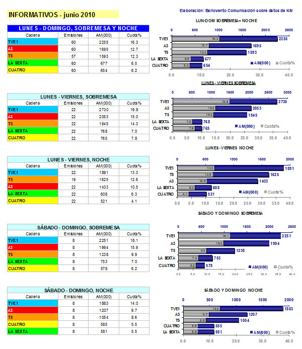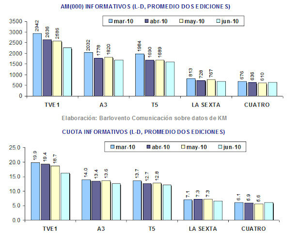 Pocas novedades este mes en cuanto a servicios informativos se refiere quedando la gran mayoría afectados por el Mundial. En el mes de junio, los informativos de La1 son los más vistos, por trigésimo cuarto mes consecutivo en la ponderación de la audiencia media de las dos ediciones de mediodía y noche. Si tenemos en cuenta los resultados cosechados desde el pasado mes de mayo, los 'Telediarios' pierden más de dos puntos. Tan sólo los informativos de Cuatro logran subir respecto al mes de mayo.