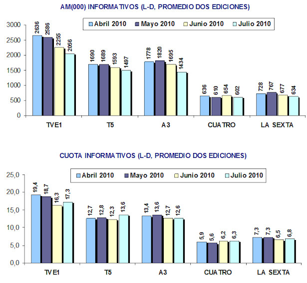 En el mes de julio, los informativos de La1 siguen como los más vistos, por trigésimo quinto mes consecutivo en la ponderación de la audiencia media de las dos ediciones de mediodía y noche. Si tenemos en cuenta los resultados cosechados desde el pasado mes de junio, los 'Telediarios' ganan un punto. Tan sólo los informativos de Antena 3 ceden cuota respecto al mes anterior.