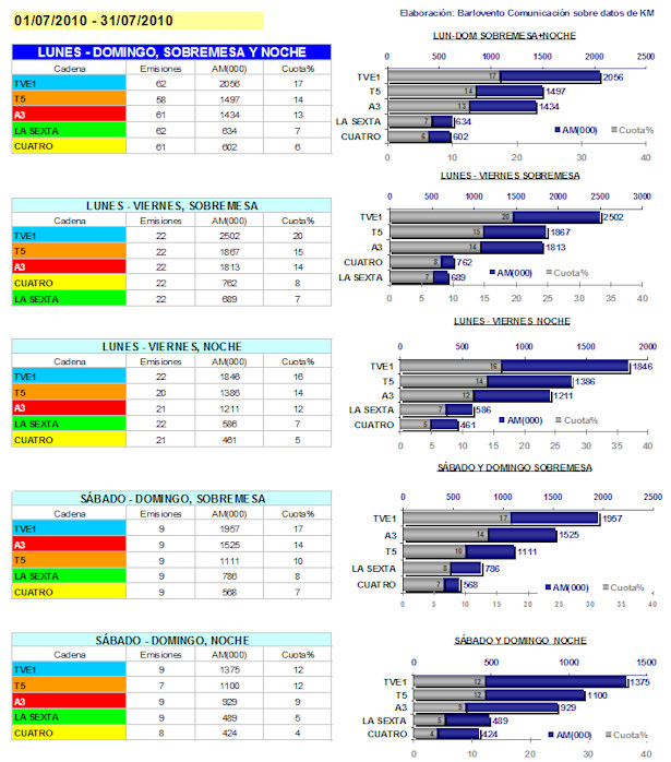 Por su parte, Telecinco sube 1,3 puntos, en parte gracias a la cobertura del Mundial de Sudáfrica 2010, y le arrebata la segunda plaza a Antena 3, siendo tercera tan sólo en las sobremesas de los fines de semana.