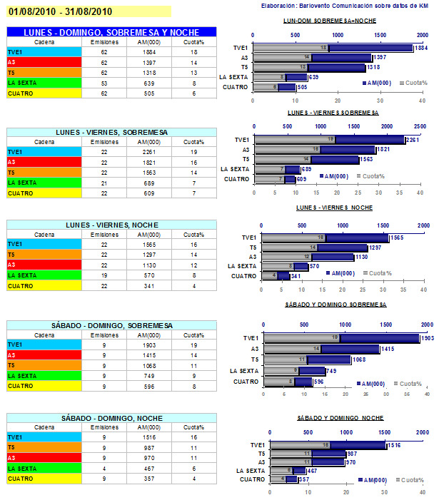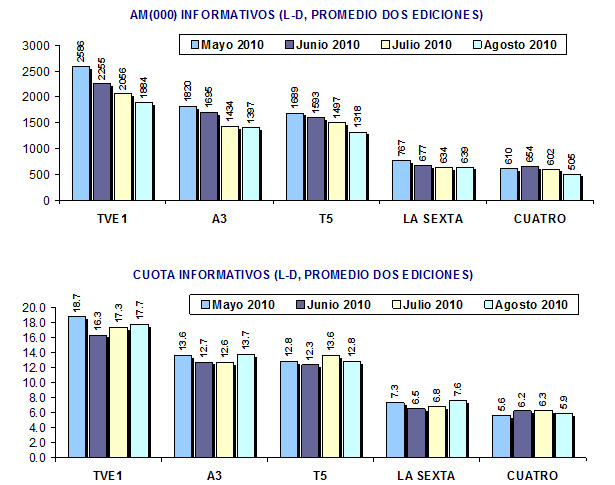 Por su lado, Telecinco sigue siendo segunda opción informativa en la edición de noche de lunes a domingo. En general, la cadena de Mediaset cede terreno en agosto, concretamente 8 décimas con respecto al dato de julio.