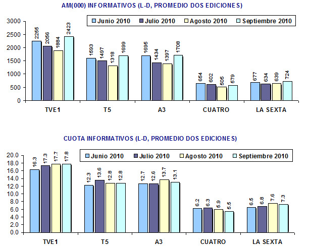 Según recoge el estudio de Barlovento Comunicación, en el mes de septiembre, los informativos de La1 siguen siendo los más vistos, por trigésimo séptimo mes consecutivo en la ponderación de la audiencia media de las dos ediciones de mediodía y noche. La pública mantiene una diferencia de 724.000 espectadores sobre Antena 3, que se mantiene en la segunda posición.