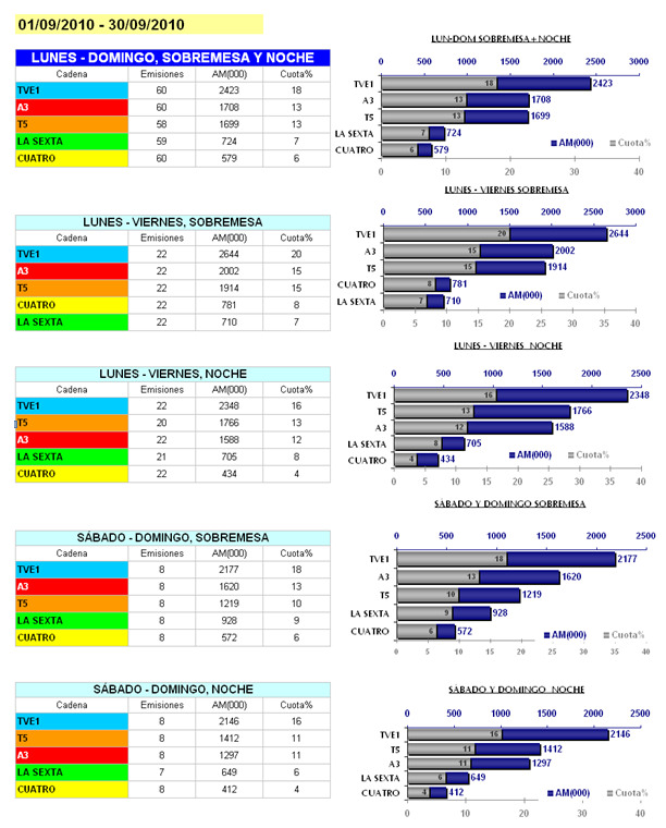 Antena 3 sigue siendo la segunda opción informativa en la ponderación de la audiencia media de las dos ediciones. No obstante, los cambios y nuevas incorporaciones en los informativos de Telecinco, ayudan a que los informativos de la cadena crezcan y se sitúen cerca de 1.000 espectadores de diferencia. La cadena de Planeta es la segunda opción informativa en la sobremesa de lunes a domingo.