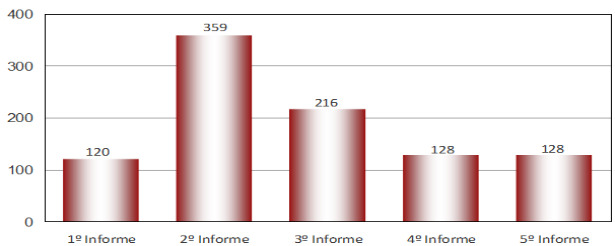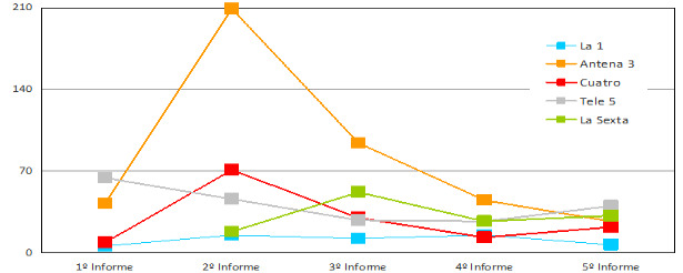 El Quinto Informe de evaluación sobre la aplicación del Código de Autorregulación de Contenidos Televisivos e Infancia recoge aquellas quejas que vienen referidas a la programación en abierto emitida durante las llamadas "franjas de protección reforzada" por las televisiones generalistas de ámbito estatal en sus emisiones analógicas. El siguiente gráfico muestra la evolución de las quejas a lo largo de los últimos años/informes: