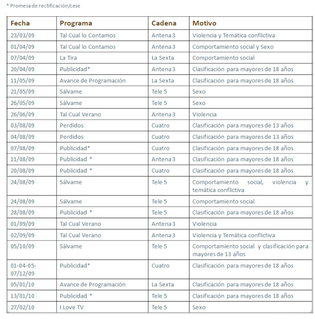 A pesar de estas cifras, las quejas aceptadas ascienden a 22. Ello supone un 17% del total de quejas presentadas, frente al 28% del periodo anterior. Por cadenas, Telecinco y Antena 3 registran el mayor número de incumplimientos reconocidos por el Comité de Autorregulación (7 en cada caso), seguidas de Cuatro (5) y de laSexta (3). Por programas, 'Sálvame' con 5 incumplimientos aceptados y 'Tal cual' con 4 encabezan el ranking.