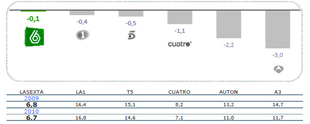 "Somos la única cadena que ha aguantado. Siendo la cadena más débil, laSexta es la que mejor ha aguantado la fragmentación", ha afirmado Contreras. De hecho, tal y como puede apreciarse en el gráfico superior laSexta tan sólo ha cedido una décima. La peor parada ha sido Antena 3 (-3 puntos), así como el conjunto de las cadenas autonómicas.