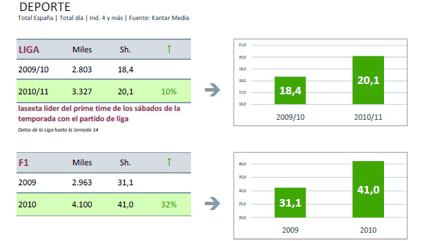 "Dijimos que los grandes eventos deportivos no sufirían la fragmentación y los datos lo han demostrado", ha dicho José Miguel Contreras. De hecho, tanto la Liga de Primera Divisón de Fútbol como la Fórmula 1 han experimentado una significativa subida con respecto a los resultados de 2009.