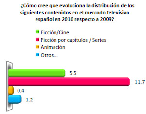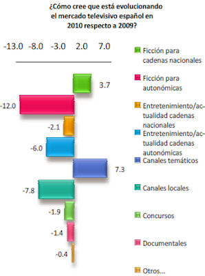 4.- En cuanto a la evolución de la producción en el mercado televisivo, se cree que en la comparativa de 2010 con el año anterior está creciendo la dirigida a canales temáticos (7,3%) y la de programas de entretenimiento o actualidad para cadenas nacionales (3,3%), ambas por encima de lo estimado en abril. Destacan los descensos producidos en autonómicas tanto en la ficción (-12%) como en el entretenimiento (-6%) y los canales locales (-7,8%).