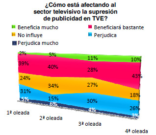 El sector ve como algo positivo la supresión de la publicidad en TVE (índice 15,3), mejorando la impresión que obteníamos en primavera (índice 6,3). Parece que en este caso la convivencia con la realidad mejora la impresión previa, una vez constatado que el dinero se ha mantenido en el medio televisión tras la agresiva política comercial de las cadenas privadas. En mayo del año pasado obteníamos un índice 1,5 en la primera ola, cuando solo se hablaba de "drástica reducción", y un 10,2 en octubre cuando ya se sabía que se trataba de la supresión total. Disminuyen de 34% a 29% quienes creen que la medida perjudicará al sector, de 27% a 18% quienes piensan que no influirá y a cambio crecen de 28% a 43% quienes piensan que beneficiará bastante.