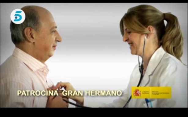'Gran hermano' tuvo este jueves un patrocinador muy especial. Se trató ni más ni menos de un organismo público: el Ministerio de Sanidad, Política Social e Igualdad que comanda Leire Pajín. Justo antes de regresar de una de las pausas publicitarias, apareció el patrocinio con un eslogan que rezaba "Con responsabilidad, ganamos salud" mientras aparecía un rotulo que decía "Patrocina 'Gran hermano'".