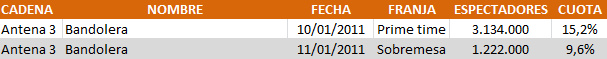'Bandolera' estrenó el que será su horario habitual a partir de ahora en sobremesa. El dato, aunque fue mucho peor que el del inicio en el prime time del lunes, no dejó de ser positivo si se compara con el resto de ofertas que Antena 3 ha venido programando en su mismo horario. La serie de Marta Hazas perdió 1.912.000 espectadores y 4,4 puntos de share.
