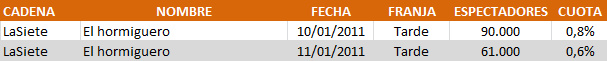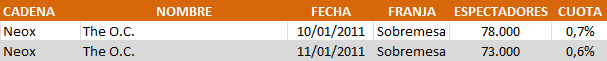 Algo parecido ocurrió con 'The O.C.', que en su horario de sobremesa no consigue levantar cabeza. Bajó una décima desde el 0,7% del lunes al 0,6% del martes, lo que se tradujo en un descenso de 5.000 espectadores.