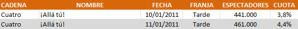 '¡Allá tú!', por el contrario, mejoró la cifra conseguida en su estreno y llegó hasta el 4,4%. El rescatado programa de Jesús Vázquez mejoró en 6 décimas y 20.000 espectadores el dato del lunes, mostrando una tendencia positiva en el segundo día de emisión.