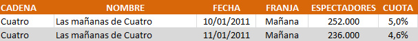 Este martes, las novedades para el nuevo año de las cadenas continuaron con su andadura por la televisión española. Algunas de ellas, mantuvieron sus datos o incluso los mejoraron como el caso de Concha García Campoy en 'Informativos Telecinco Matinal'. Otros, descendieron aunque mantuvieron unas cifras aceptables como 'Buenafuente' o 'Al rojo vivo' en laSexta2 y productos como 'Fama ¡a bailar!' notaron una bajada considerable.