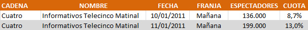 El mejor dato en su segundo día de emisión lo consiguió Concha García Campoy, que consiguió alzar 'Informativos Telecinco Matinal' hasta el 13%. También fue muy resaltable la cifra en espectadores, hasta 63.000 espectadores.
