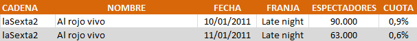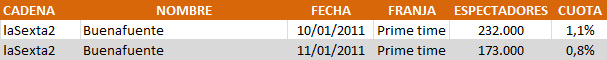 Por su parte, el dato de 'Buenafuente' en el prime time de laSexta2 también descendió en tres décimas y 59.000 espectadores respecto al estreno en la cadena el pasado lunes.