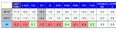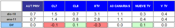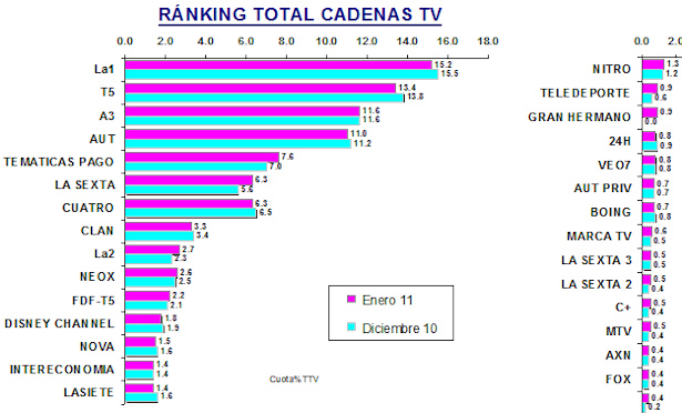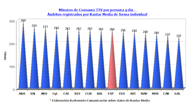 Enero de 2011 es el mes de mayor consumo televisivo de los últimos doce meses, con una media de 260 minutos al día por persona, si bien, es un minuto menos que en enero del año pasado y seis más que en diciembre. Aragón y Valencia son las comunidades que más tiempo dedican a ver la televisión, mientras que Galicia y Canaria las que menos.