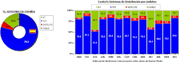 El consumo de televisión a través de TDT crece tres décimas en enero firmando así su máximo mensual. De esta manera, la TDT representa el 79,3%, el Cable supone el 15,2% (una décima menos que en diciembre), el Satélite el 5,5% (cuatro décimas más) y el Analógico Terrestre registra su mínimo con un 0,1%.