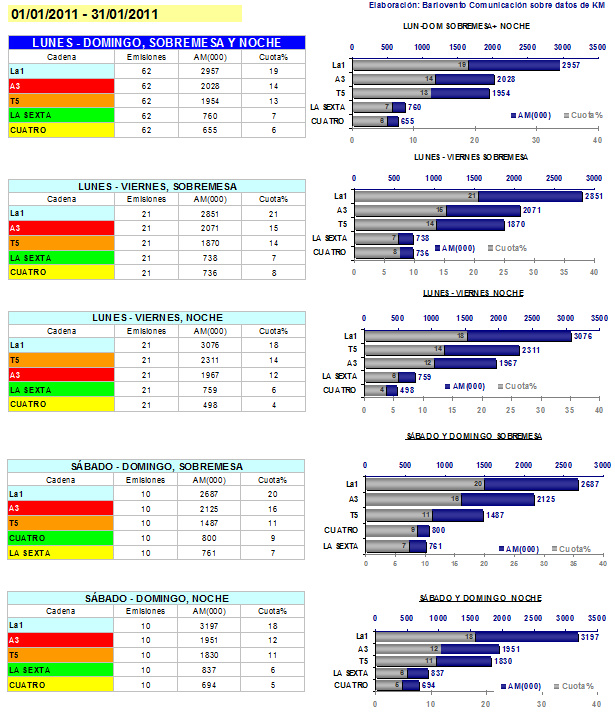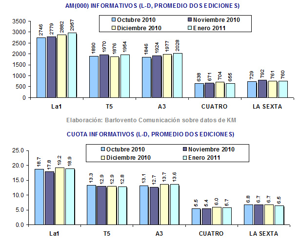 Antena 3 ocupa la segunda posición informativa en las sobremesas laborables y en las de los fines de semana, así como en las noches de sábados y domingos. La cadena de Planeta no sufre variación alguna -en cuanto a posiciones- con respecto al mes de diciembre. 'Antena 3 noticias' baja una décima, aunque en número de espectadores pasa de los 1.977.000 a los 2.028.000.