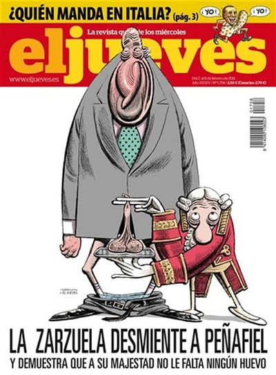 Y nunca mejor dicho lo de primera plana y es que al hilo de esta anécdota que contaba Peñafiel en Telecinco, la ácida revista El Jueves decidió salir este miércoles en portada con una caricatura de Su Majestad en la que, con los pantalanos bajados y con la ayuda de un criado, muestra sus genitales. Dos y sobre bandeja de plata, para ser más exactos. El único texto que acompaña a tan "real" dibujo es: "La Zarzuela desmiente a Peñafiel y demuestra que a Su Majestad no le falta ningún huevo".