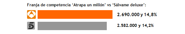Sin embargo, en su franja de competencia, el nuevo concurso de Antena 3 logró ganar a 'Sálvame deluxe'. El espacio de Antena 3 superó al de Telecinco en 6 décimas y algo más de 100 mil espectadores: