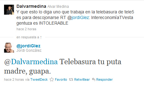 Jordi González ha conseguido convertirse en trending topic gracias a un comentario realizado en Twitter y por el que posteriormente se ha disculpado. "Telebasura tu puta madre", decía el citado mensaje en el que respondía a unas declaraciones de una seguidora.