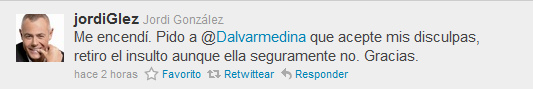 La conversación continuó cuando otro usuario le preguntó por qué se alteraba tan pronto, a lo que Jordi González contestó que no es pronto, "ya son muchos meses viendo y escuchando barbaridades". "Vamos a ver: cuando alguien tilda de telebasura algo que eligen y consumen X personas está insultado a esas X personas, o no nos damos cuenta?", añadió González. El presentador ya ha intentado calmar la polémica y ha pedido disculpas por tan desafortunadas palabras.
