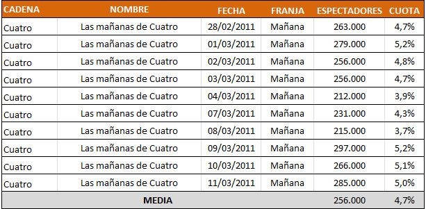 Las cifras son muy similares a los de la anterior etapa con Concha García Campoy. En su última temporada, 'Las mañanas de Cuatro' se estrenó con un 3,5% aunque logró subir unas décimas y asentarse en una cifra que rondaba el 5%, algo insuficiente para Telecinco, el nuevo dueño de Cuatro, y que le ha llevado a tomar la decisión de su desaparición de la parrilla para buscar un producto más efectivo.