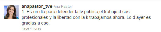 Ana Pastor ha aprovechado el interés generado por su entrevista este martes al Presidente de Irán Mahmud Ahmadineyad para defender la actual televisión pública. En unas declaraciones realizadas en su cuenta personal de Twitter, la presentadora y directora de 'Los desayunos de TVE' ha dado su apoyo al actual modelo que sigue Televisión Española y ha afirmado que ahora trabajan con libertad.