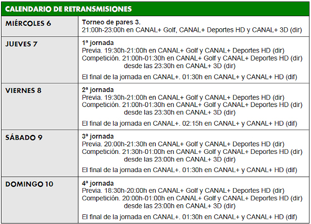 Canal+ y Canal+ HD (dial 111, en Alta Definición), por su parte, emitirán por la noche, en diferido, las dos últimas horas de juego en cada jornada. Además, los aficionados también podrán seguir el Masters en directo desde Internet, así como en dispositivos iPhone y iPad.