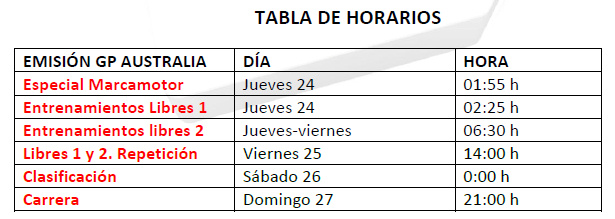MarcaTV ofrecerá todo el Gran Premio de Australia para que los espectadores y amantes del mejor motor no pierdan detalle de este espectacular mundial. El viernes, a las 14:00 horas, ofrecerá la repetición de los Entrenamientos Libres I y II para aquellos que no pudieron verlo en directo.