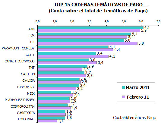 La suma de las casi 80 Cadenas Temáticas de Pago (6,4%) bajan seis décimas con respecto al mes de febrero. Logran conservar, sin embargo, el liderazgo en la franja horaria de la madrugada. Las cadenas más vistas son, por este orden, AXN (0,4%), FOX (0,3%), Canal+ (0,3%) y Paramount Comedy (0,3%).