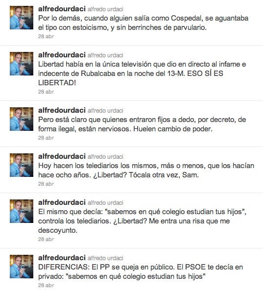 La palabra libertad aparece repetida en varias entradas del periodista, pero siempre en tono jocoso. "Libertad había en la única televisión que dio en directo al infame e indecente re Rubalcaba en la noche del 13-M. Eso sí es libertad".
