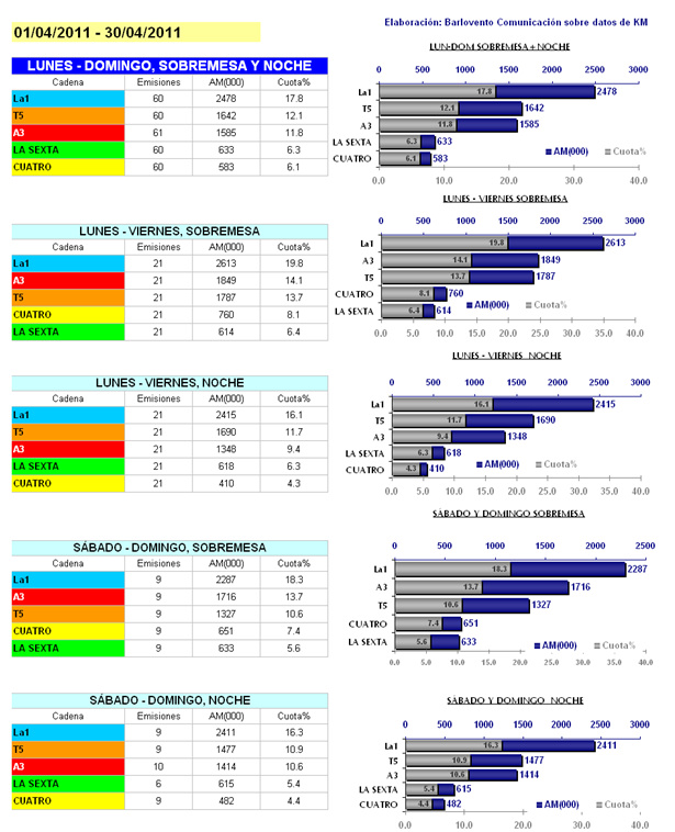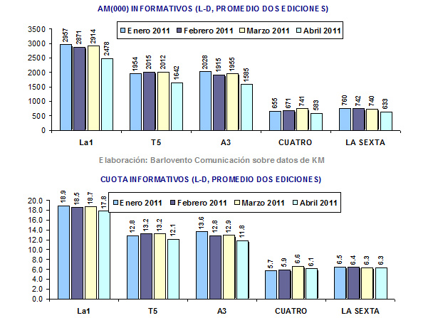 Televisión Española, con los 'Telediarios', supera en 836.000 espectadores a Telecinco, que mantiene la segunda plaza. La cadena de Mediaset cae de un 13,2% a un 12,1% con un total de 1.642.000 espectadores. La cadena de Mediaset España cede 1,1 puntos y 370.000 seguidores. Los 'Telediarios cierran' abril con un 17,8% de cuota y aumentan la distancia con sus competidores hasta los 5.7 puntos, la mayor ventaja en los últimos 12 meses