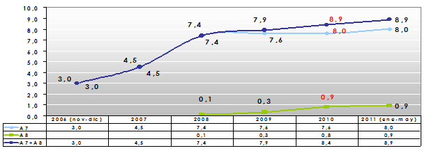 TPA alcanza el 9% de share sumados los canales A7 y A8. La cadena ha obtenido el respaldo de los espectadores como demuestra la evolución de las cuotas de audiencia de estos cinco años, en los que A7 ha crecido un 171,6%, desde el 3 % de 2006 hasta el 8,0% de 2011, según datos de Kantar Media, cuyas mediciones comenzaron en Asturias en el mes de noviembre de 2006.