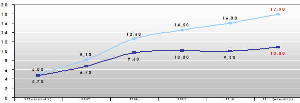 'TPA Noticias 1' (de lunes a domingo) pasó de una cuota del 5% en 2006 al 17,9% en 2011. Por su parte, 'TPA Noticias 2' (de lunes a domingo) pasó del 4,7% de share de 2006 a un 10,8% de audiencia en 2011